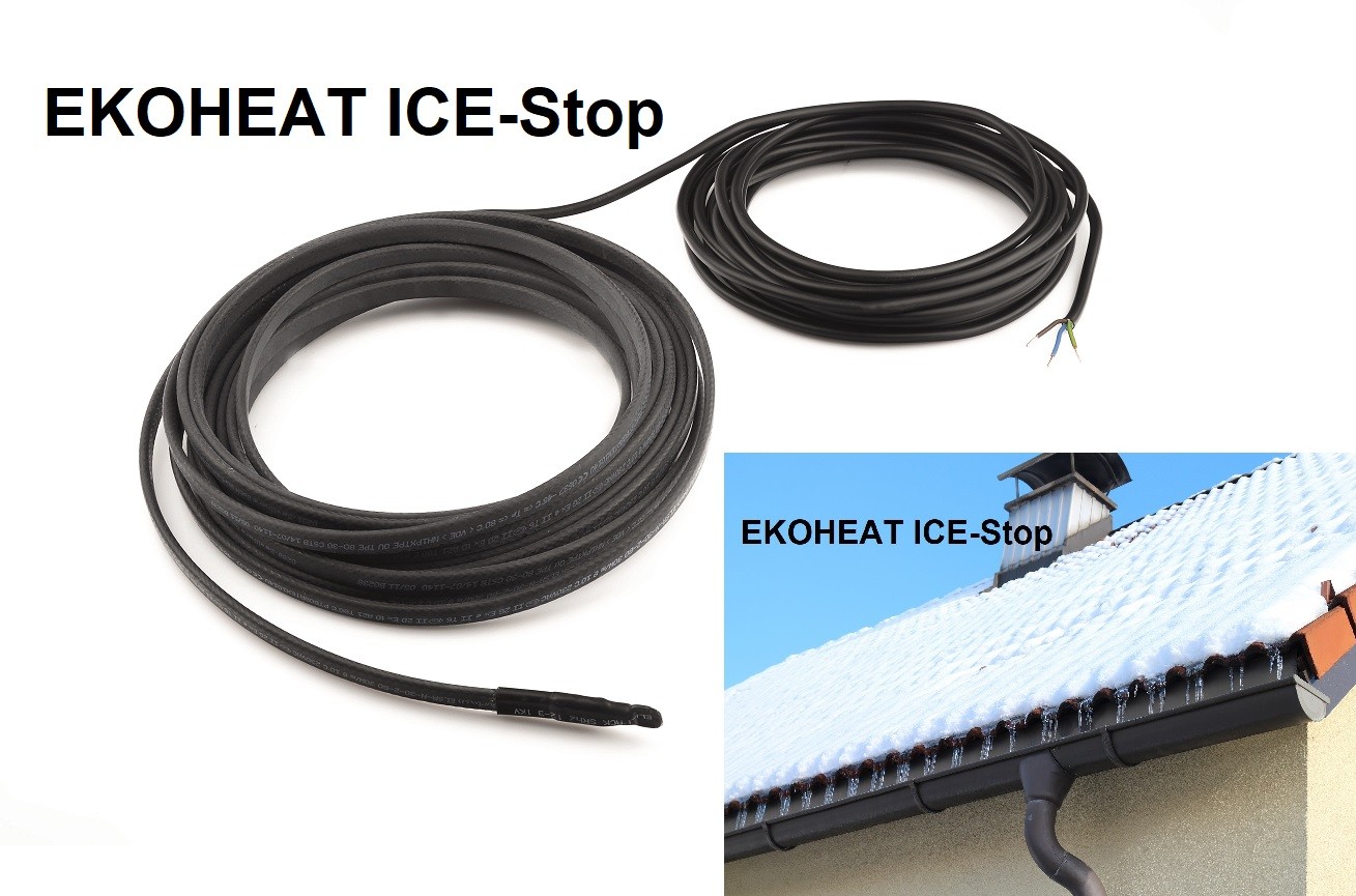Instalací samoregulačního topného kabelu EKOHEAT ICE-Stop do okapu jsou problémy vyřešeny. Samoregulační kabel EKOHEAT ICE-Stop je již opatřen přívodním kabelem v délce 8m, tedy dostatečným pro připojením k elektrické síťi 230V. Samoregulační vlastnost topného kabelu umožňuje automatické snižování a zvyšování výkonu podle okolní teploty. Tím, jednak reaguje na aktuální vývoj počasí, a také optimalizuje provozní náklady. Topný kabel EKOHEAT ICE-Stop se jednoduše položí na dno žlabu a nechá se volně viset ve svodu a o další se nemusíte starat. Tento kabel může být využit i pro mnoho dalších aplikací, jako jsou ohřev pojezdové kolejnice brány, odtok z klimatizace nebo tepelného čerpadla, ohřev palem, jezírek proti plnému zamrznutí a mnoho dalších.