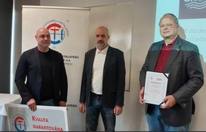 Obr. vlevo značka Kvalita Garantována CTI ČR pro Testo, obr. vpravo značka Kvalita Garantována CTI ČR pro Grohe. Certifikáty a logotyp společně předali Tomáš Hruška a Jiří Tesák, zástuci komise Cechem podporované kvality.