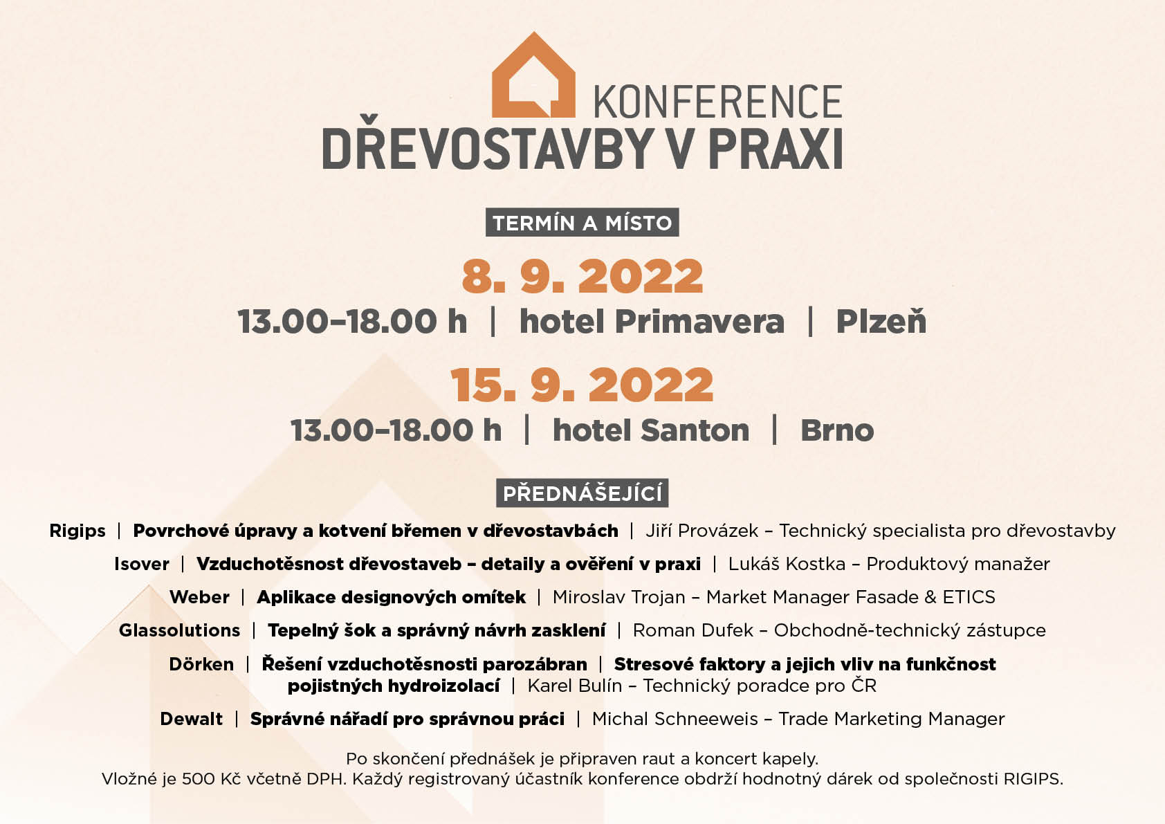 Přátelé všech dřevostaveb jsou vítáni na dalším ročníku tradiční konference Dřevostavby v praxi. Letos se konference koná ve dvou termínech a to 8. 9. 2022 v hotelu Primavera v Plzni a 15. 9. v hotelu Santon v Brně. Zajistěte si své místo na www.drevostavbyvpraxi.cz.