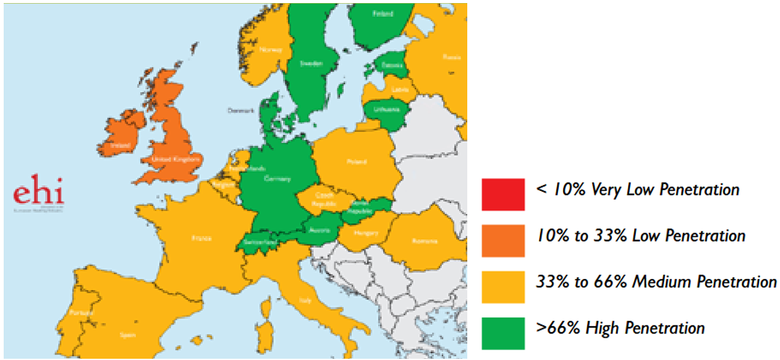Podívejme se v ročence na to, jak je popisován stav uplatnění velkoplošných systémů vytápění a chlazení. Zdroji informací a grafů je Association of the European Heating Industry (EHI). (Issued by: Interessengemeinschaft Energie Umwelt Feuerungen GmbH)