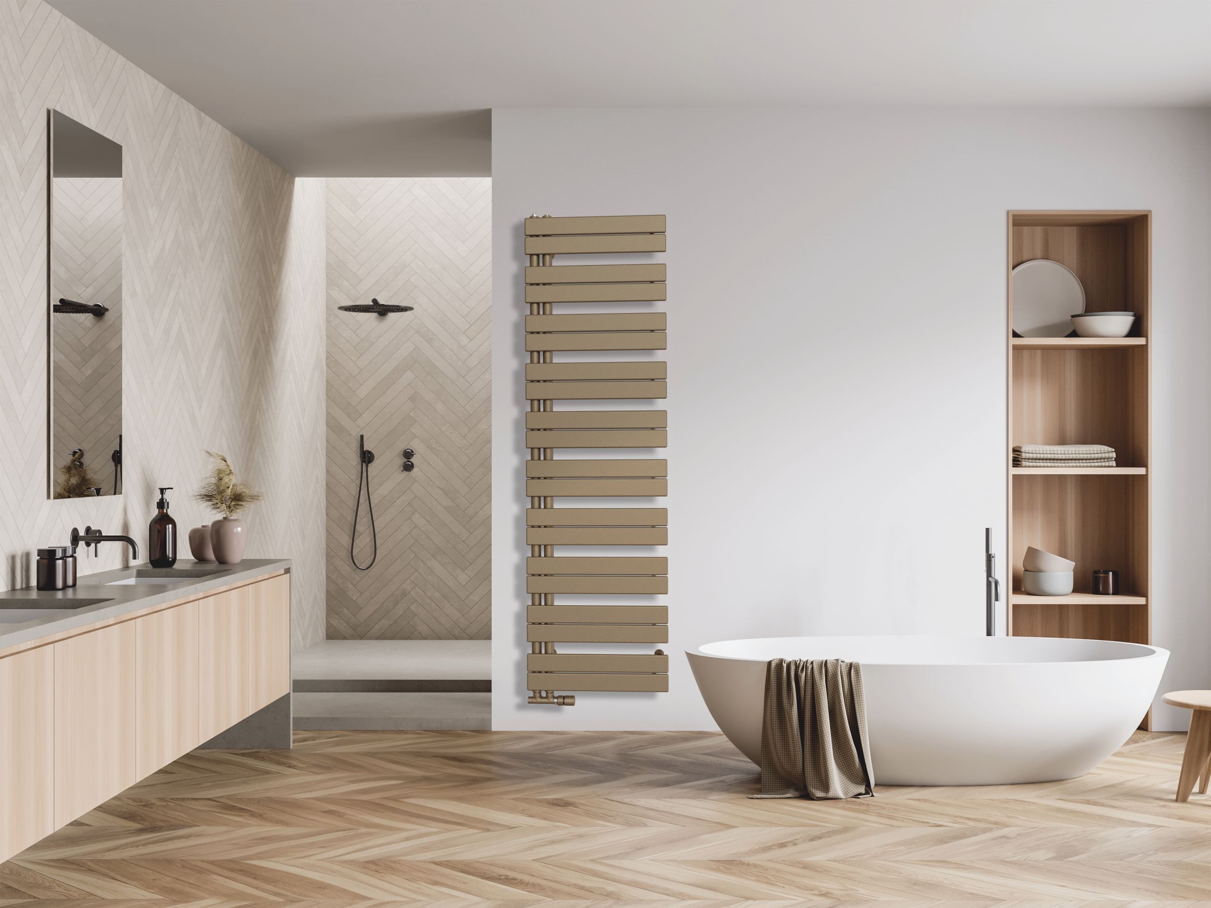 Nový koupelnový radiátor Zehnder Roda Duo zaujme svým klasickým nadčasovým designem: kulaté svislé sběrné trubky a vodorovné přesné ploché trubky v asymetrickém uspořádání umožňují pohodlné boční zasunutí a předehřátí ručníků a osušek.