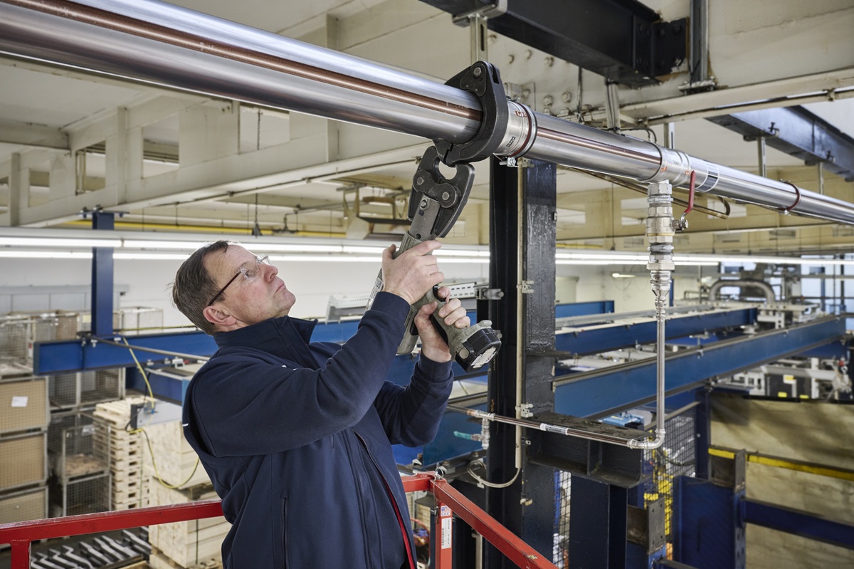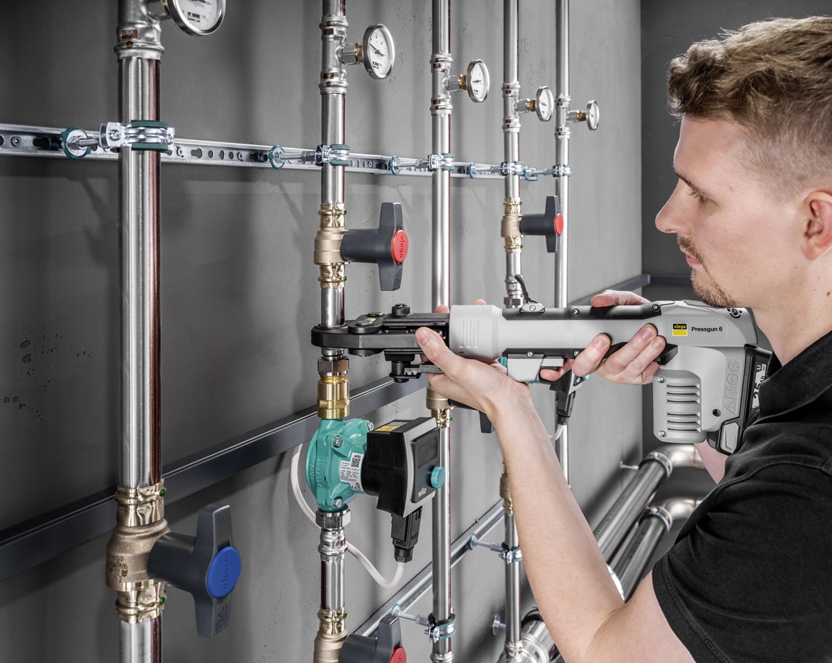 Lisování systému Temponox se provádí pomocí osvědčeného nářadí Viega Pressgun, takže není potřeba žádné nové vybavení. Oproti svařování lze navíc montážní čas zkrátit až o 80 %. (foto: Viega)