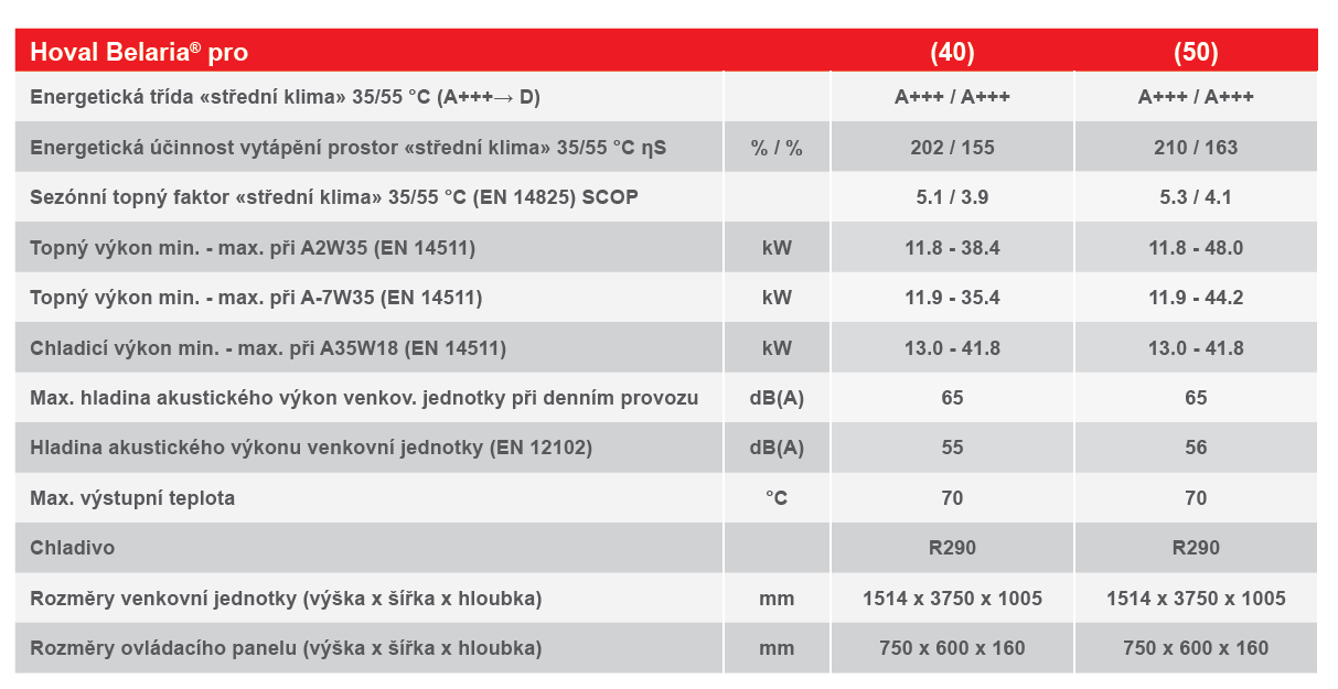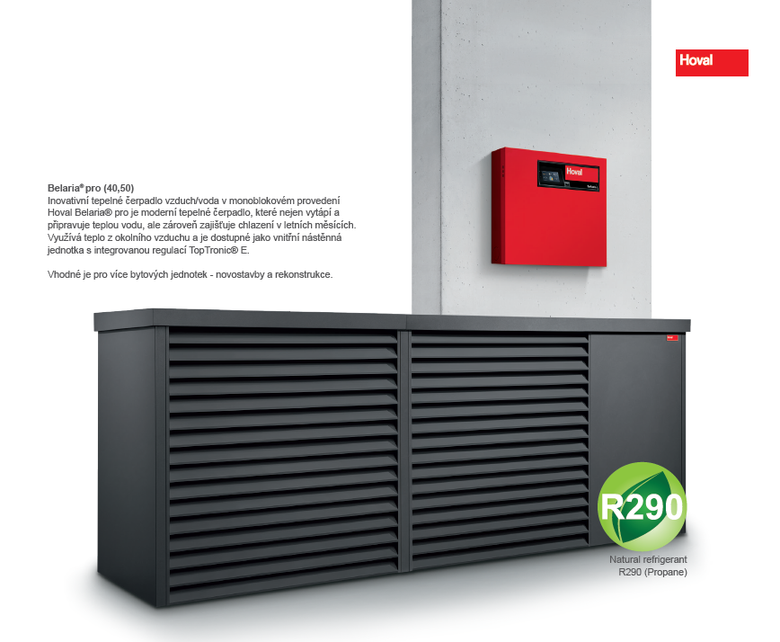 Společnost Hoval včas přešla na přírodní chladivo R290 (propan). S GWP (potenciál globálního oteplování) nižším než 3 představuje R290 ekologickou alternativu k syntetickým chladivům, jejichž GWP často přesahuje 2000. Díky vynikajícím termody¬namickým vlastnostem pracuje Belaria® pro (40, 50) efektivně – i při vysokých výstupních teplotách. Tím již dnes splňuje požadavky EU, které budou platné od roku 2027 pro ekologi¬cká monobloková tepelná čerpadla do 50 kW.