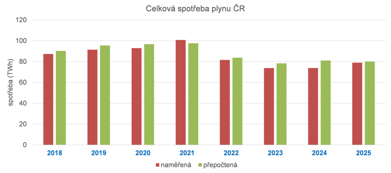 Spotřeba zemního plynu se v naměřených hodnotách v České republice v roce 2025 oproti předchozímu roku zvýšila o 6,9 % na 79 TWh. V teplotně přepočtených hodnotách ale podle poradenské společnosti EGU poklesla o přibližně 1,2 %. Tento výsledek je daný velmi výrazným teplotním rozdílem mezi posledními dvěma topnými sezonami.