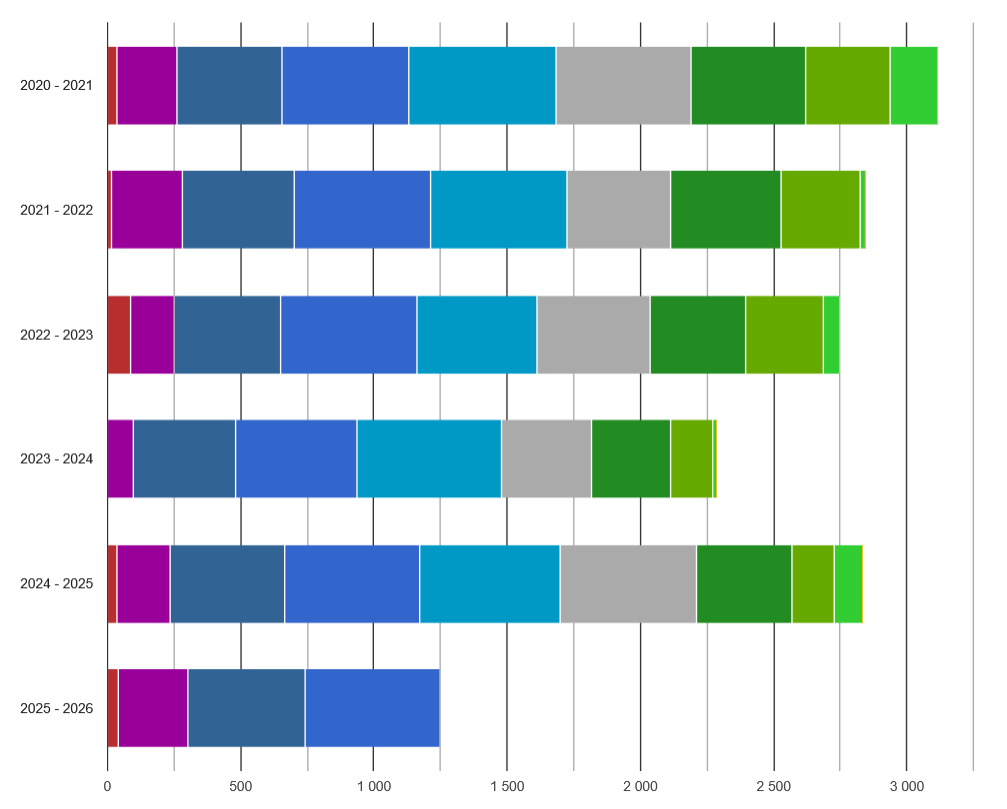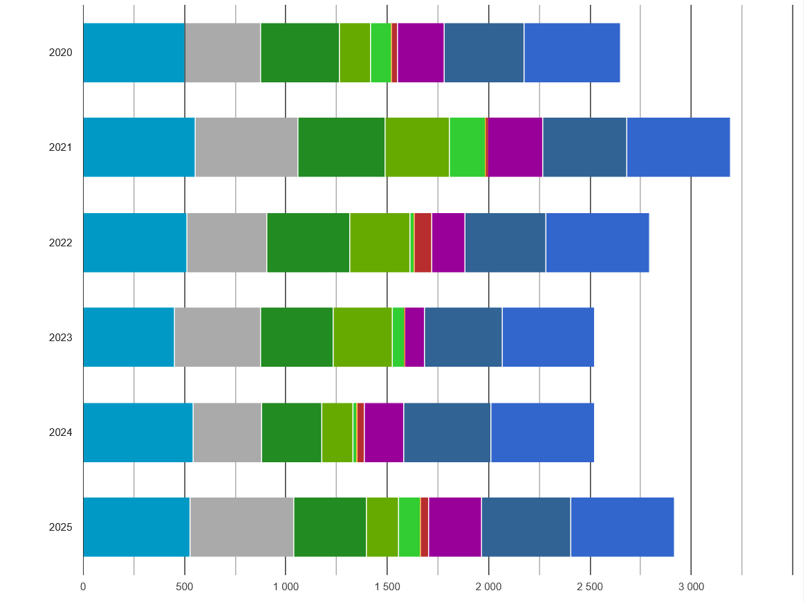 V grafu 1. jsou barevně odlišeny počty denostupňů, které byly dosaženy v jednotlivých měsících roku a celý pás pak představuje součet denostupňů za celý rok. Rok začíná 1. lednem a končí 31. prosincem. Je zřejmé, že rok 2025 je ve sledovaném období druhý nejchladnější.