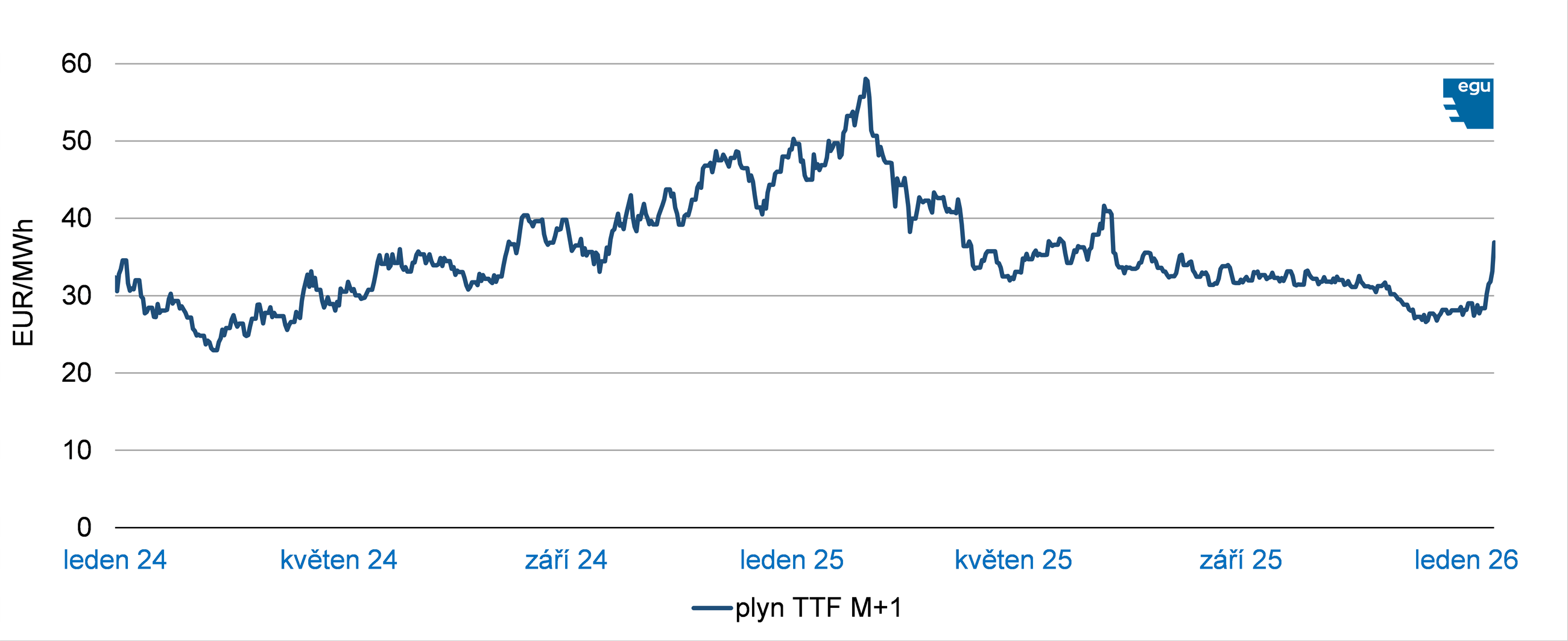 Průměrná cena zemního plynu na evropském trhu v roce 2025 dosáhla 36,4 EUR/MWh, tedy přibližně o 5 % více než v roce předcházejícím. Výrazný růst ceny na začátku roku a následný několikaměsíční postupný pokles byly reakcí na geopolitické události a tržní fundamenty, konkrétně vysokou globální nabídku LNG, nižší odběr LNG v Číně a výrazně na počasí závislou výrobu elektřiny z plynu v EU.